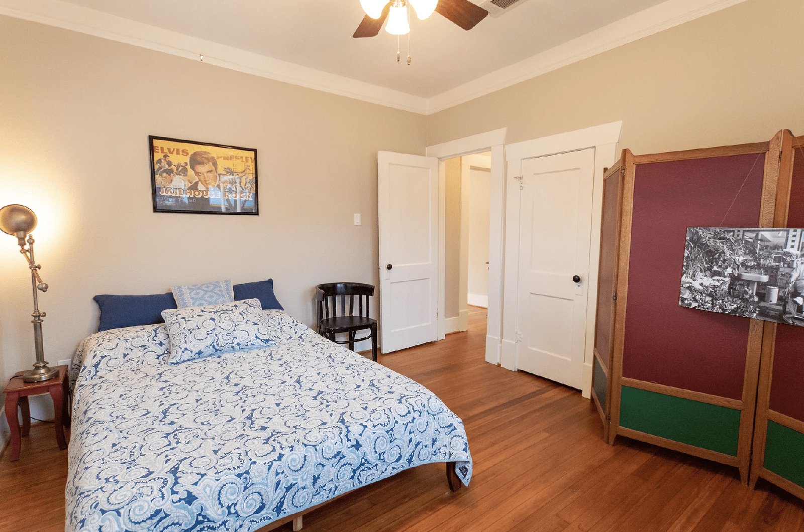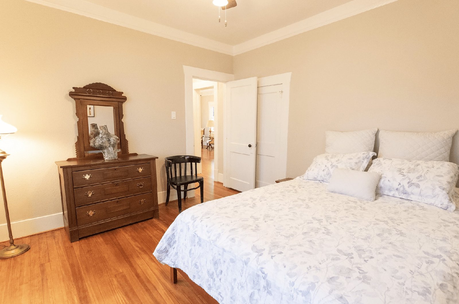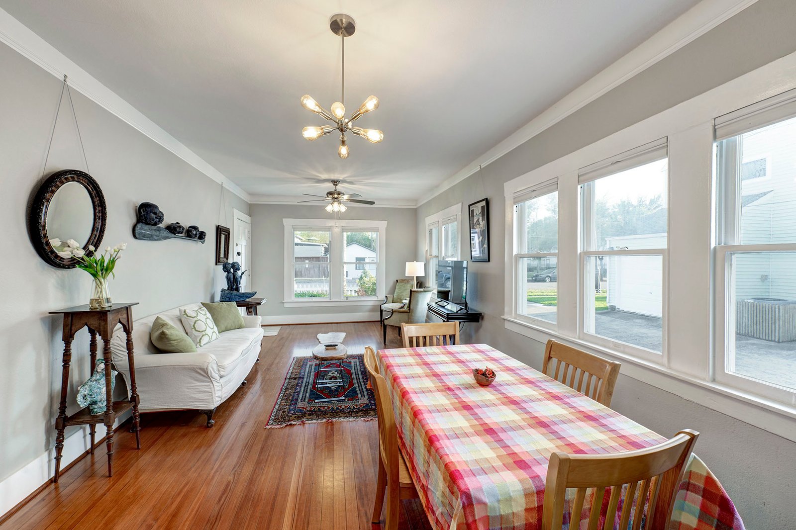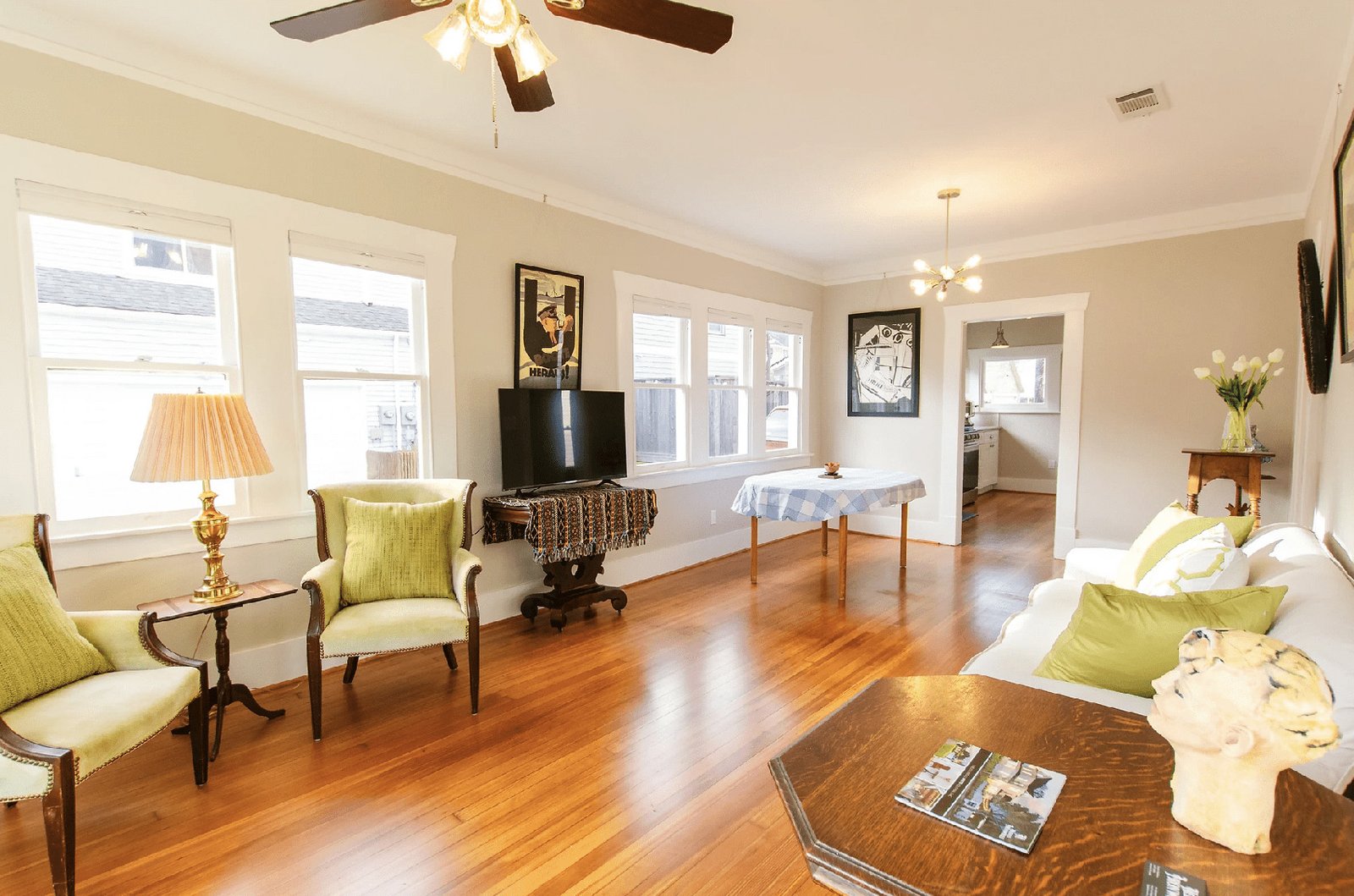 The Bluebonnet Suite is a cozy two-bedroom bungalow with queen beds, a spacious living room, and fun art decor. The full kitchen and large dining table make it welcoming for guests, who also have access to laundry and free parking. Enjoy time outside on the front porch. Centrally located in the Houston Heights, The Bluebonnet Suite offers a comfortable home base for your stay.